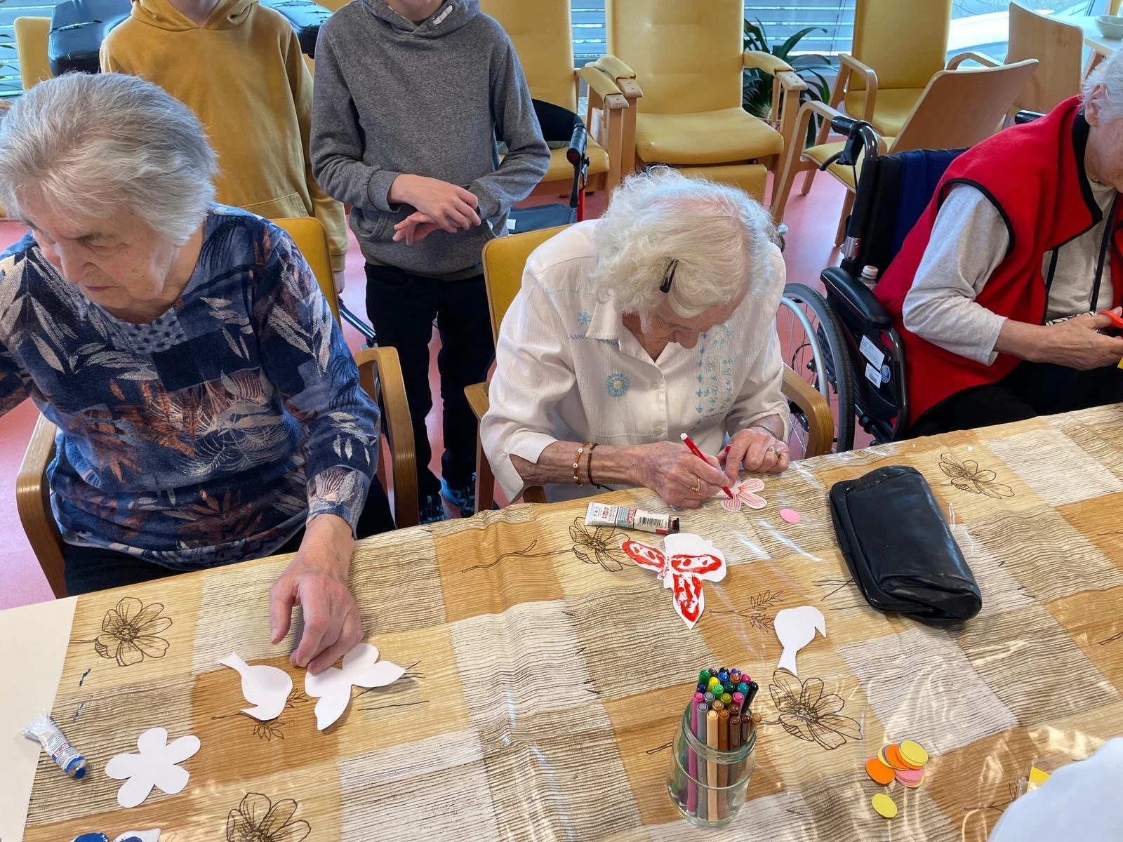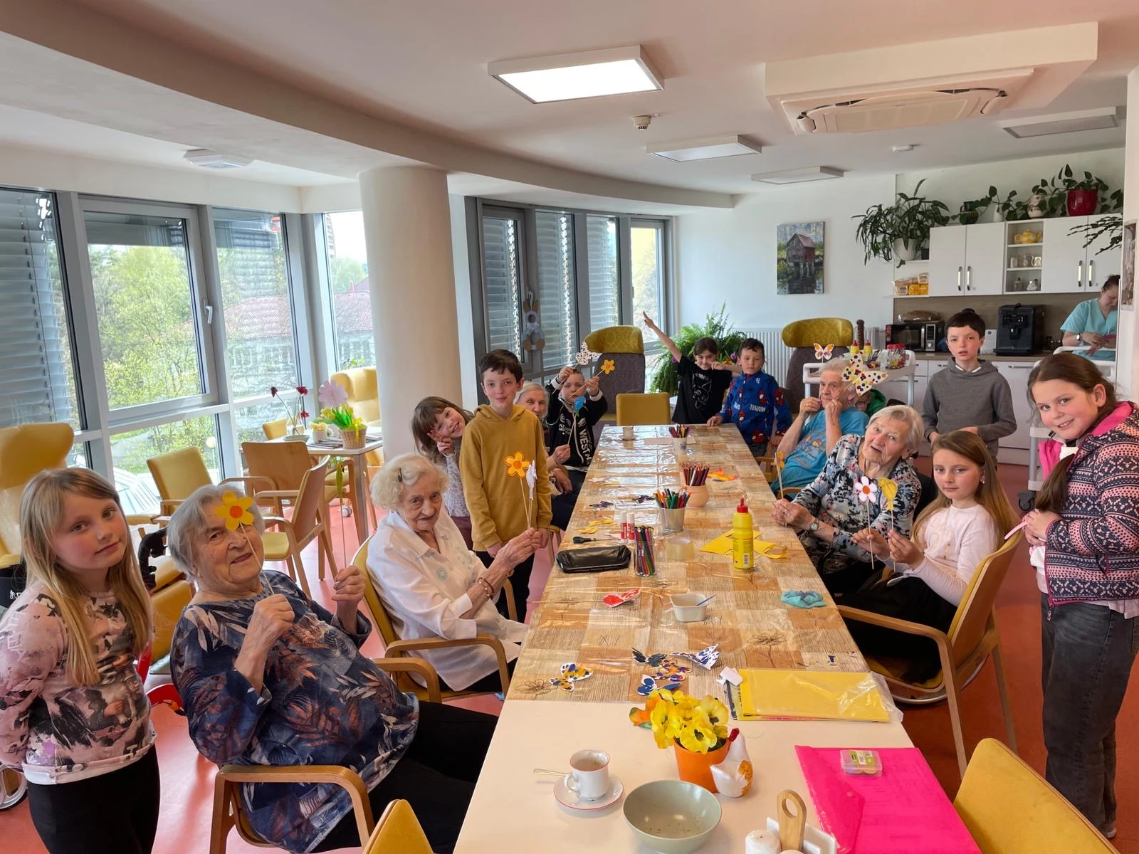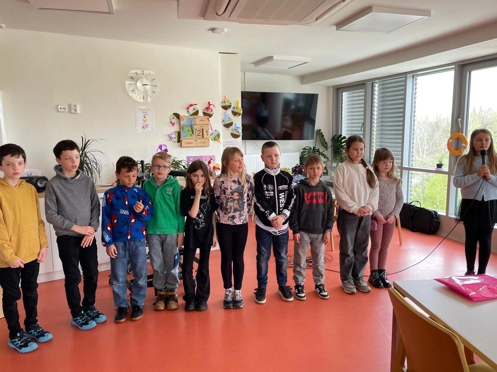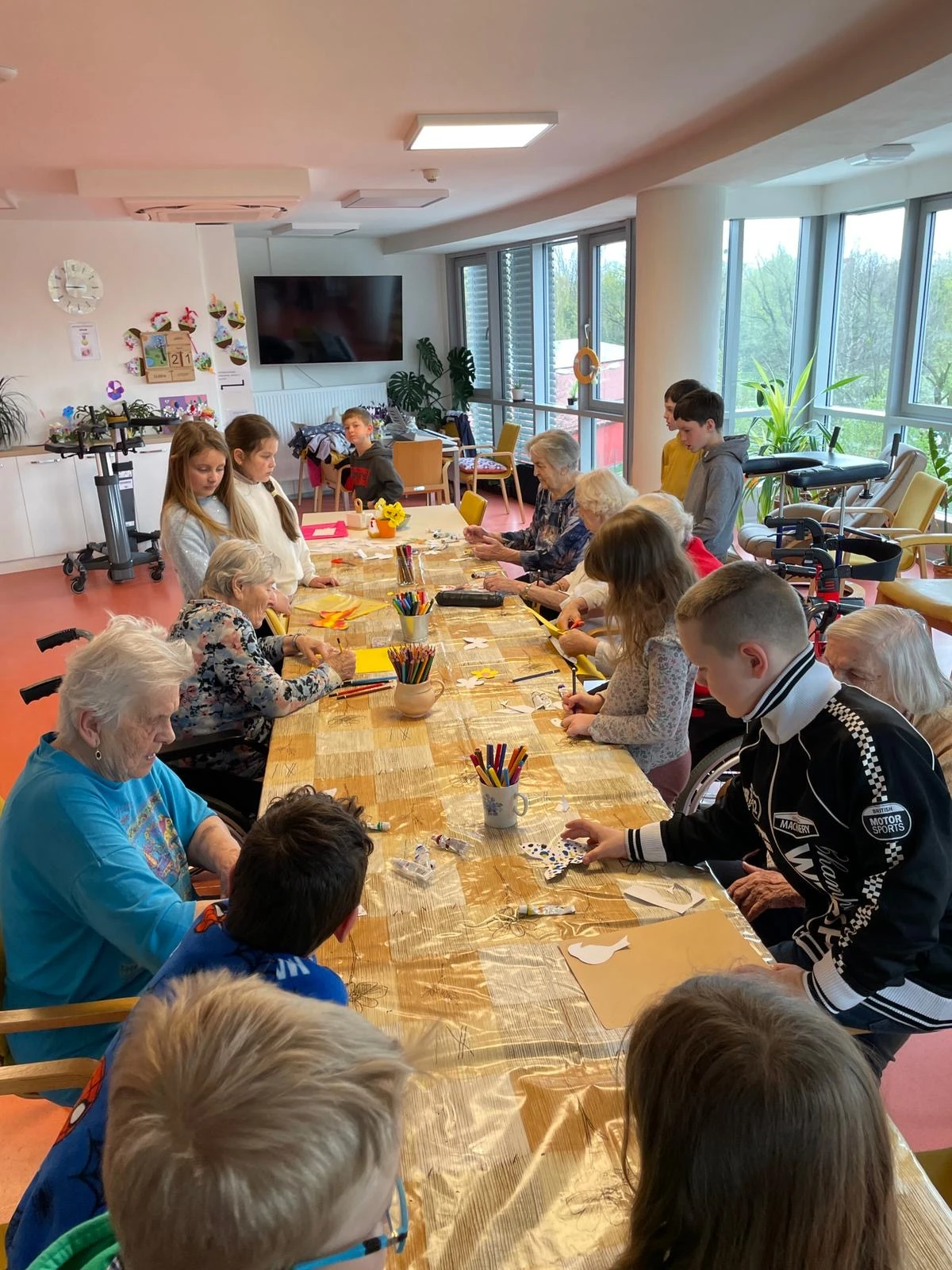 Dnešní úterní odpoledne 21. 4. 2026 patřilo návštěvě seniorům v Domově na ul. 28. října. Jako obvykle jsme toto milé setkání zahájili vesele, a to zpěvem nejznámějších lidových písní s doprovodem kláves. Těchto hudebních tónů jsme si dále všichni mohli užít při poslechu dvou sólových skladeb v podání Karolíny Holubové ze 4.A. S příjemnou náladou jsme se pak společně pustili do tvoření jarních zápichů do květináčů. Děti se zapojily s pomocí seniorům při obkreslování, stříhání nebo lepení motýlů, květinek nebo ptáčků. Vytvořené dekorace vyzdobily pokoj zúčastněným seniorům, kteří se s láskou loučili s dětmi a budou se těšit na další společné setkání.