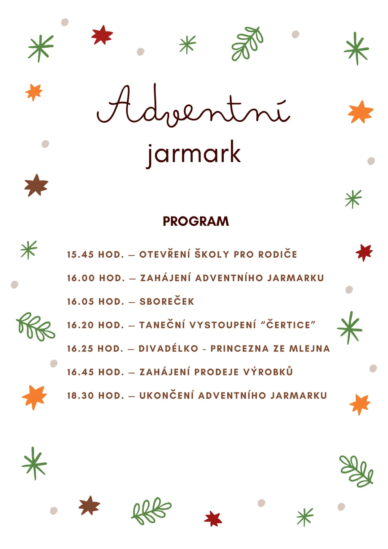 srdečně Vás zveme na tradiční Adventní jarmark s tematikou staročeských Vánoc, který se uskuteční na naší škole. Přijďte si užít předvánoční atmosféru, dětská vystoupení a rukodělné výrobky našich žáků. Společně se naladíme na adventní čas, podpoříme děti a prožijeme kouzlo staročeských Vánoc.