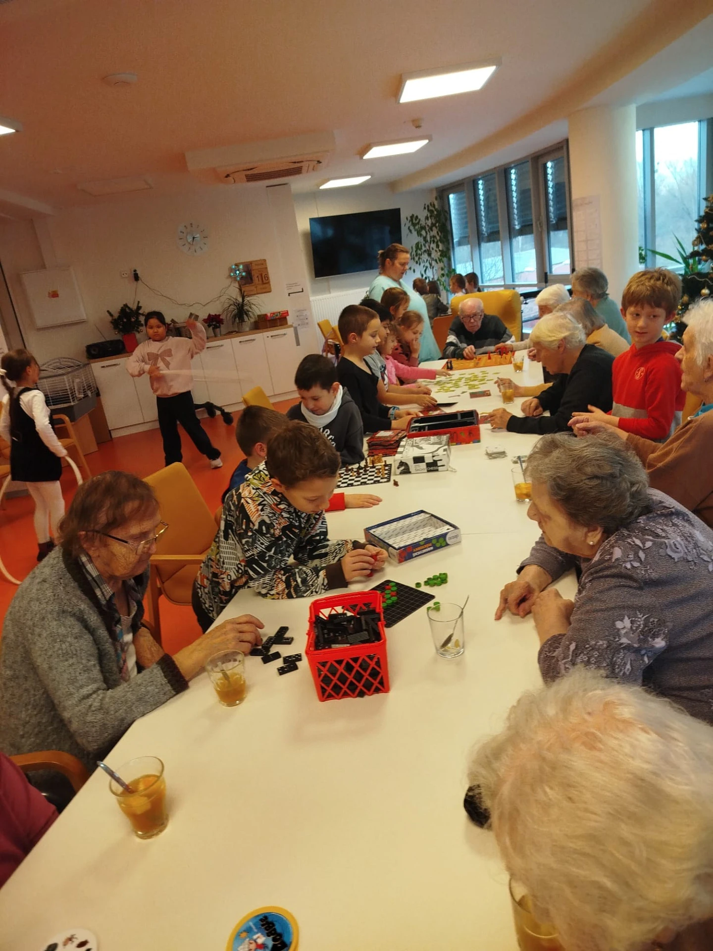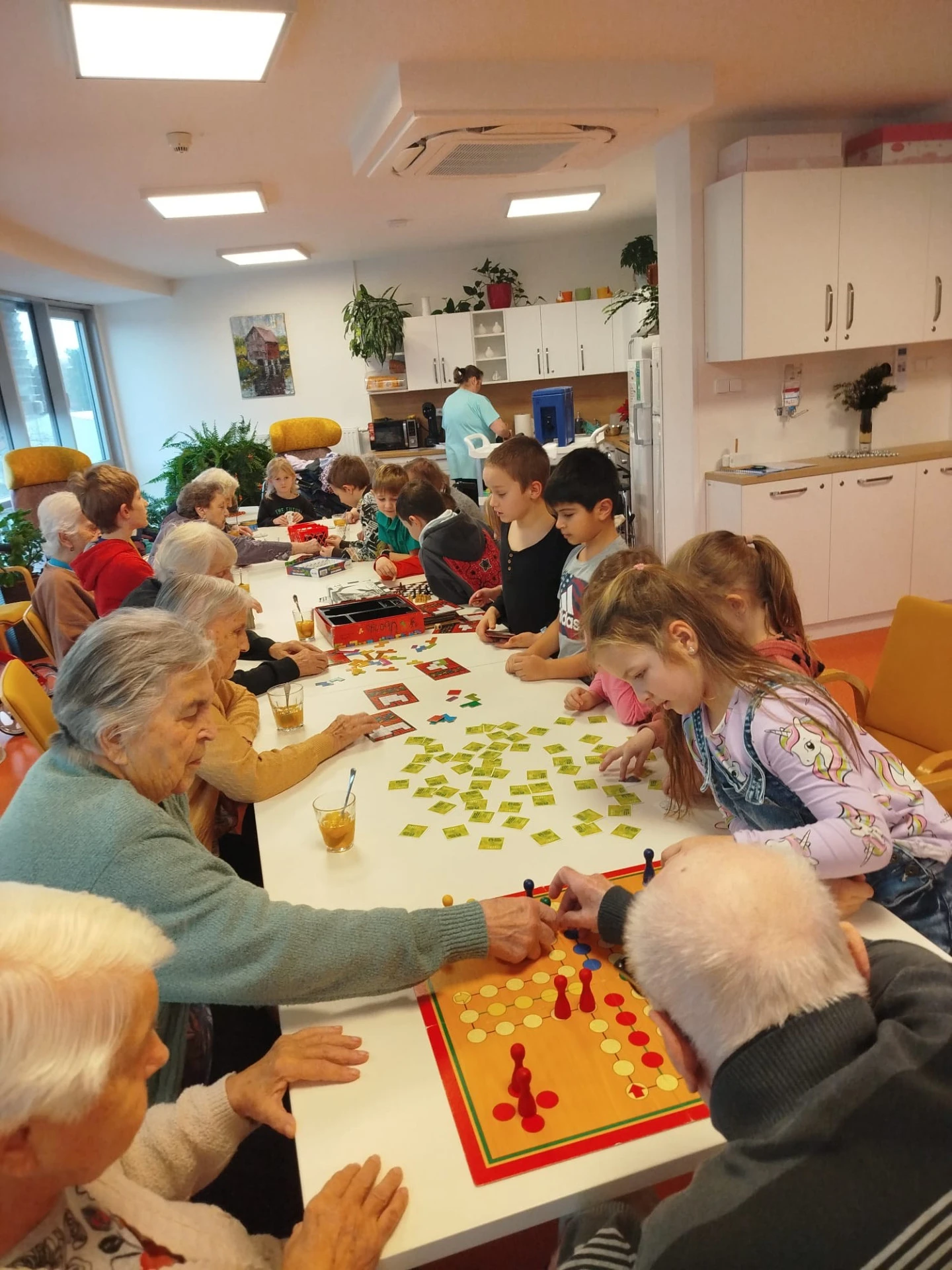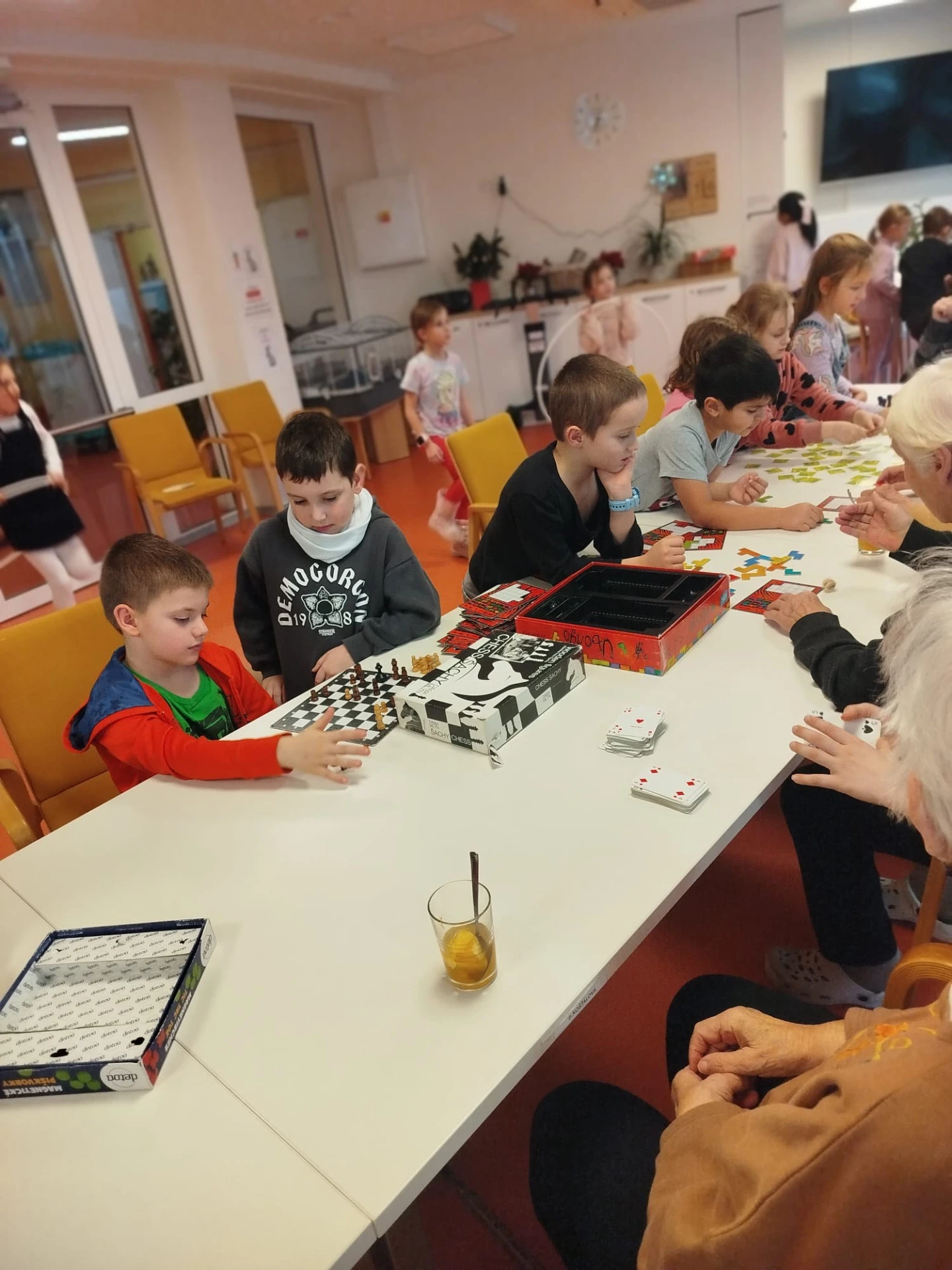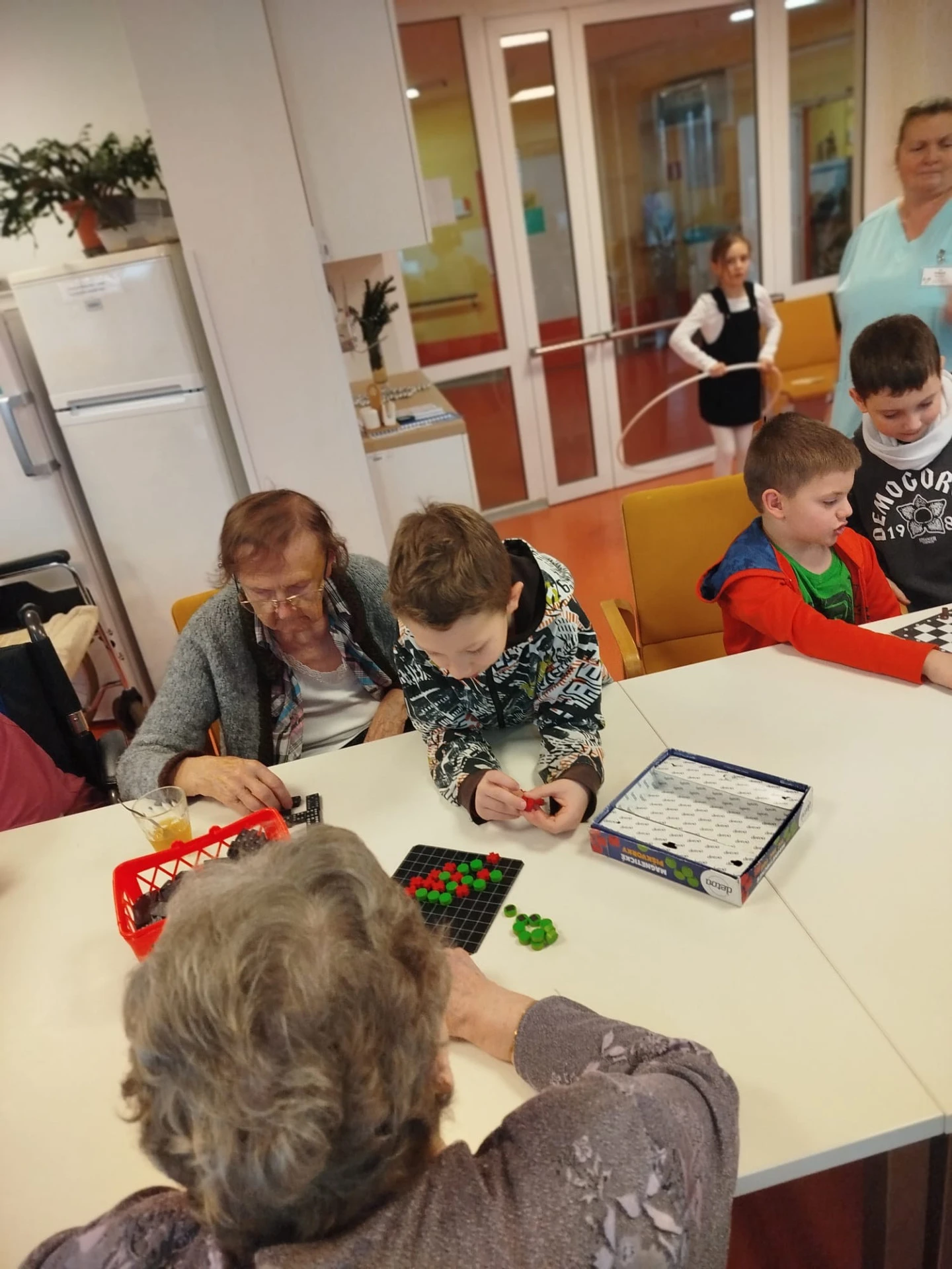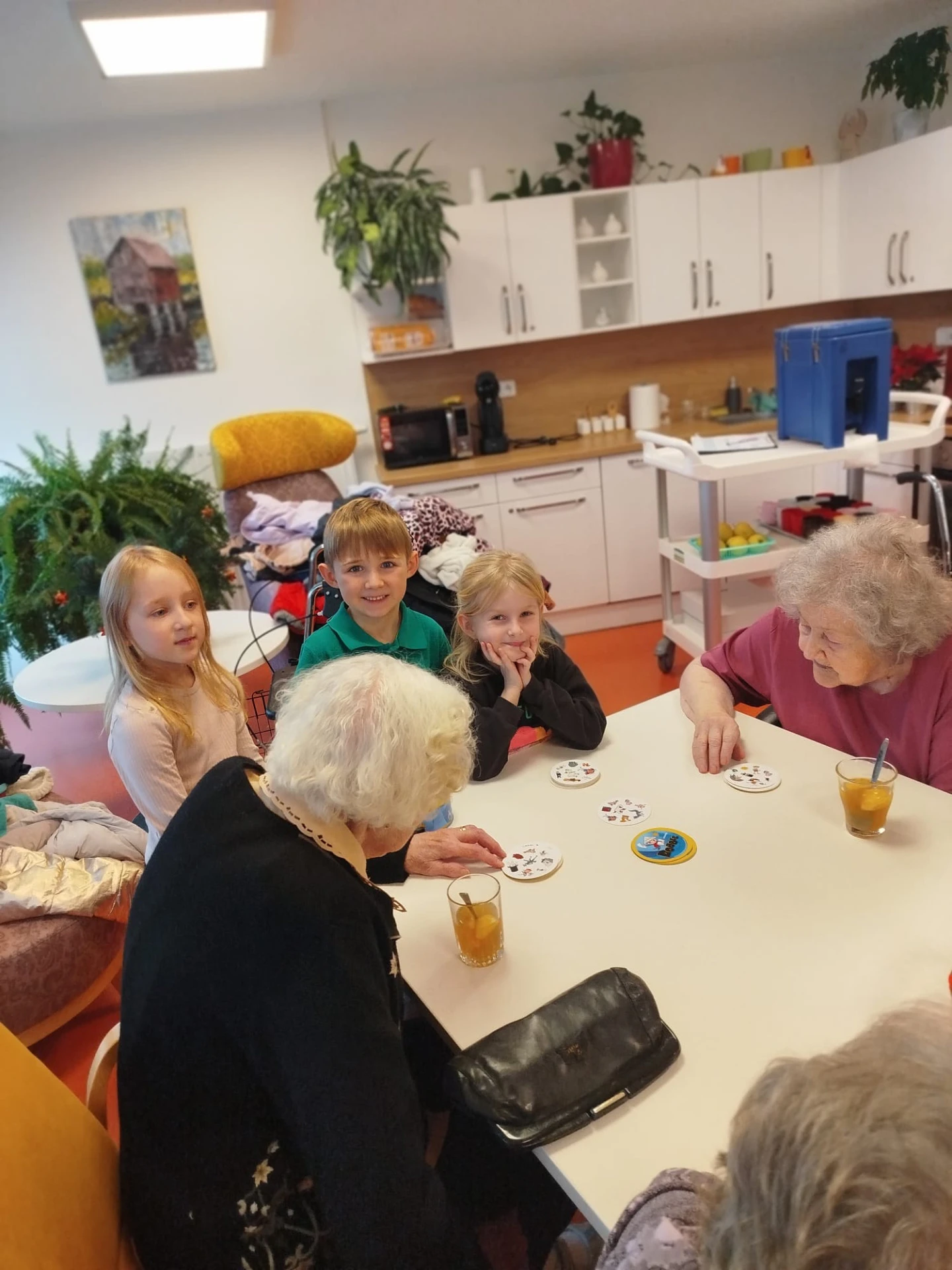 Děti ze školní družiny navštívily domov pro seniory na ul. 28. října dne 16. 12., aby obyvatelům zpestřily den, přinesly radost, zábavu a potěšení. Nově se představily děti z 1. C, zazpívaly písničky –Adámku náš, O drakovi a společně s dětmi 2.A – Vánoce, Vánoce přicházejí, Stojí vrba košatá.Na klavír doprovázel Oliver Kubíček. Sólově zazpíval Marek Tremboš- Pásli ovce Valaši. Následovala pohybová chvilka, šikovná děvčata točila obručí kolem svého těla. Po krátkém vystoupení se děti rozdělily na skupiny a začaly hrát s babičkami a dědečkem deskové hry. Dobble, Magnetické piškvorky, Šachy, Žížaly a nejvíce zaujala hra Ubongo, ve které se skládají geometrické tvary. Vánoční atmosféra, zaujetí pro činnost, klid a pohoda. Budování respektu, úcta ke stáří, propojení světa seniorů a dětí je cílem našeho projektu. A ten se nám daří.