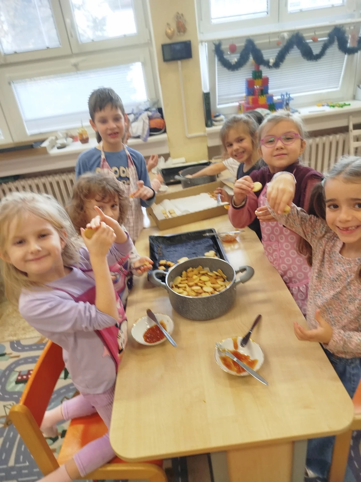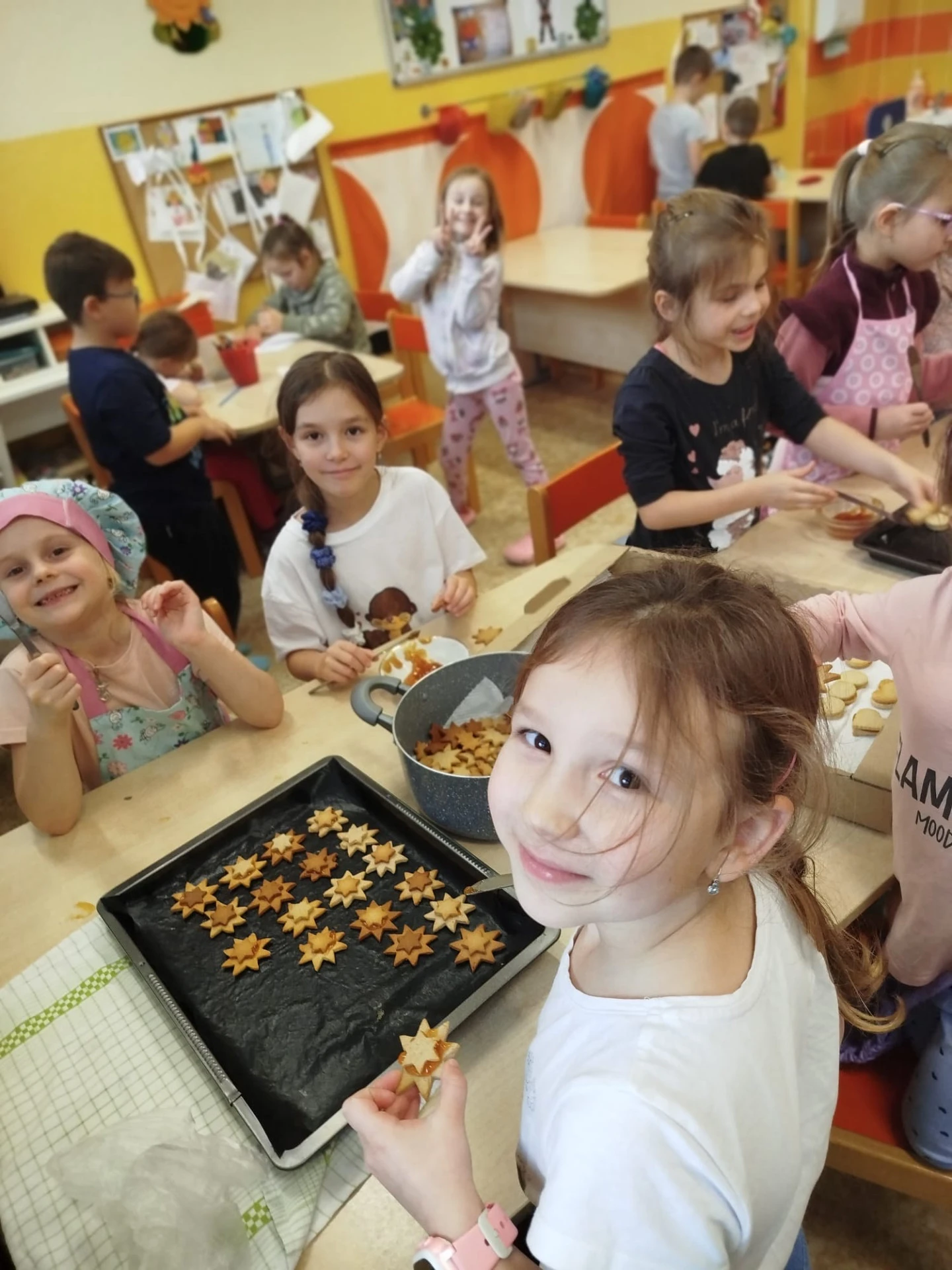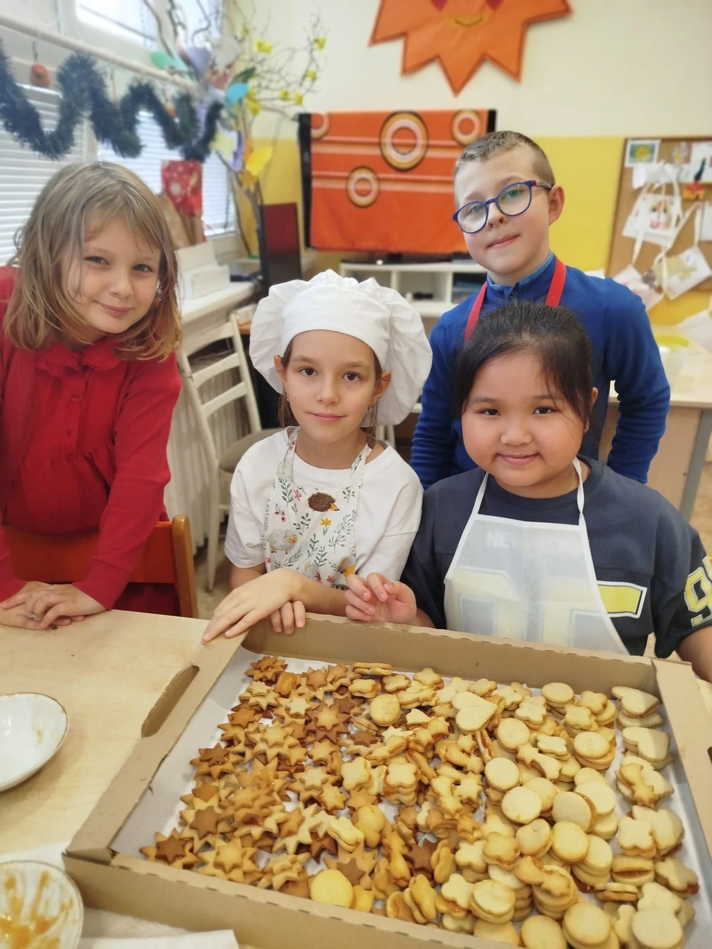 Gastronomie pro děti, připravovaná dětmi je stále oblíbenou a žádanou zájmovou činností ve školní družině. V září 2025 si děti vyzkoušely studenou kuchyni – menu na narozeninovou oslavu. Zjistila jsem, že nejvíce dětem chutnaly zelené okurky a bylo náročné “ubrzdit“ ochutnávání surovin než vznikl finální výrobek. V říjnu jsme pekli perníkový moučník s jablky. Dětem velmi chutnal. Následující listopadový kuchtík byl zaměřen na zdravou svačinku z ovoce a zeleniny, která se zapékala v toustovači. Také úspěšná volba, děti jedly s chutí. A závěr kalendářního roku se nesl v duchu českých vánočních tradic, peklo se linecké a skořicové cukroví, medové perníčky. Všichni si užívali vykrajování hvězdiček, srdíček a razítkování medových vloček, baněk. Hovořilo se o Vánocích. Nechyběla dobrá nálada, dětský smích a příjemná atmosféra. A to hřeje u srdce.