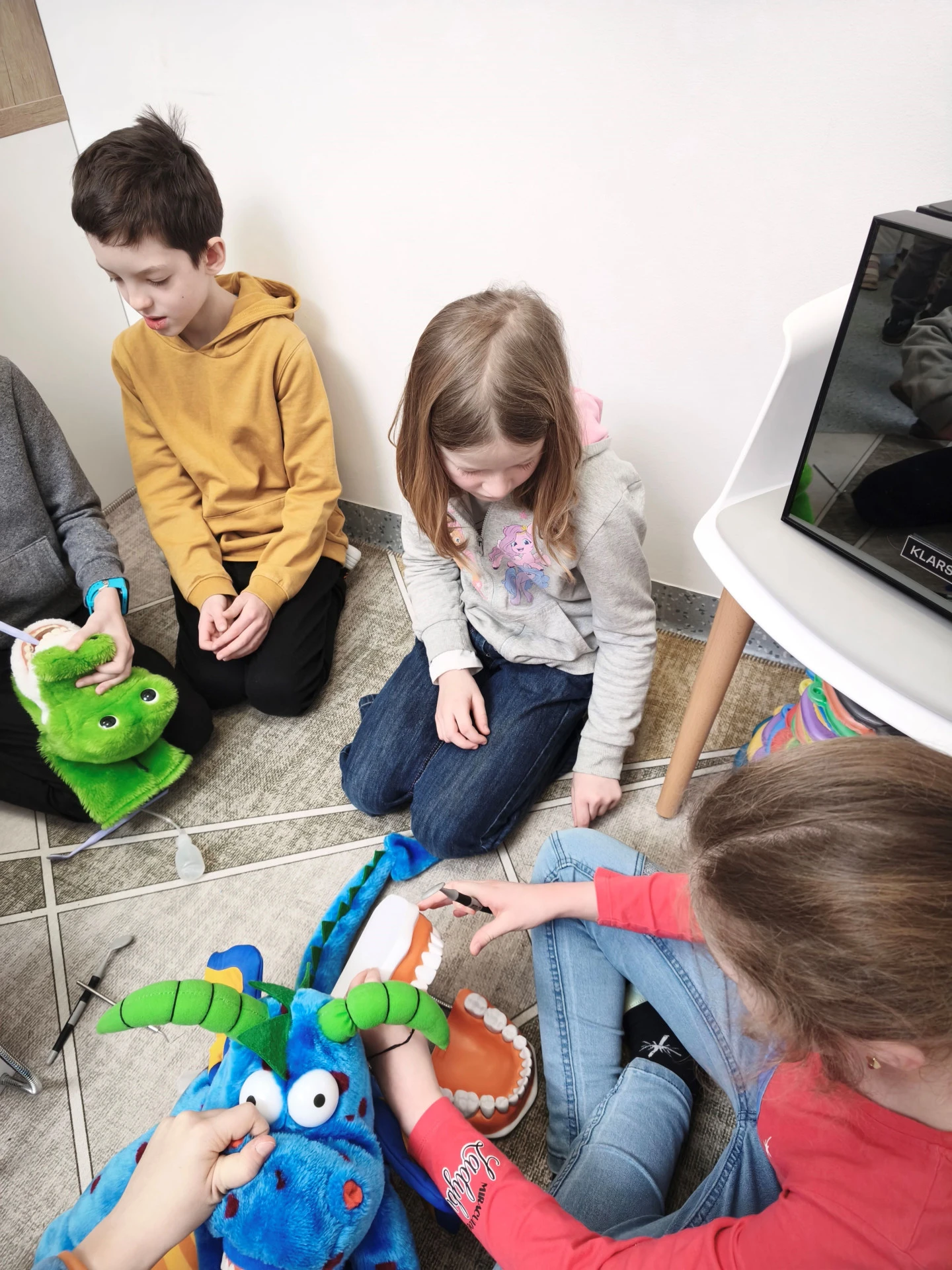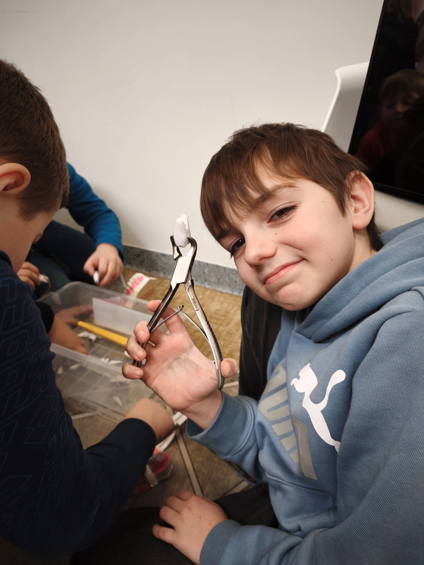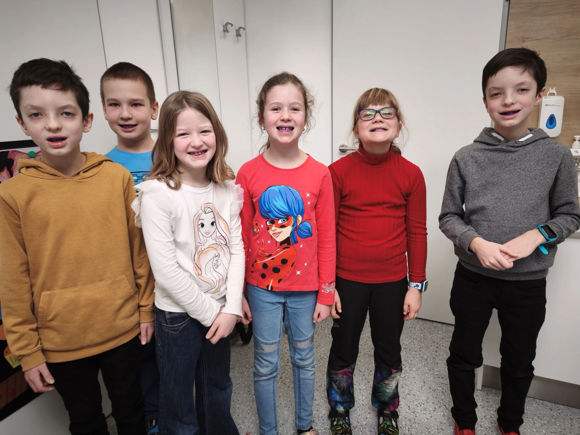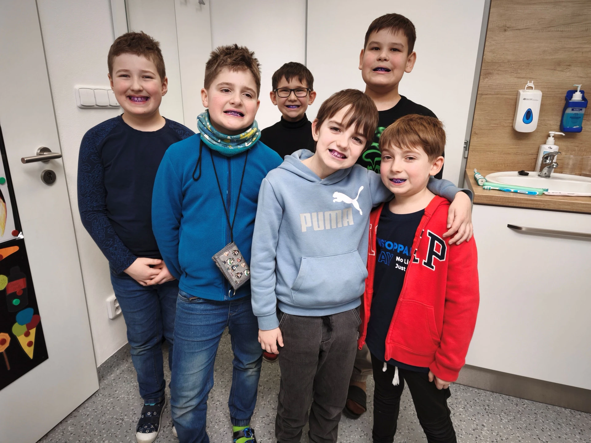 Vyzkoušeli jsme si ovládání křesla, plombování a trhání zubů, prohlížení zoubků pomocí opravdových malých zrcátek. Bavilo nás, když nám sestřička zkoušela fialovou tekutinou, která zviditelnila to, kde byly zuby špatně vyčištěné. Měli jsme fialové zuby i pusu, a to bylo legrační.