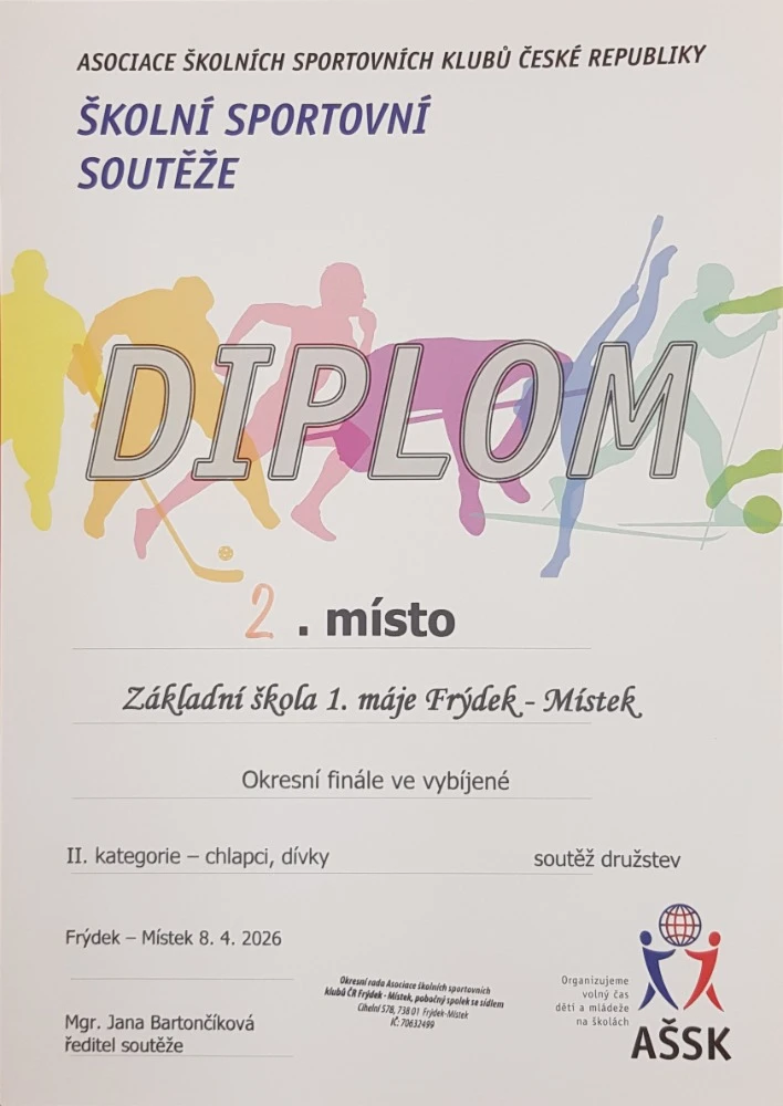 Naši žáci 4. a 5. ročníků úspěšně zvládli dne 26. 3. 2026 okrskové kolo ve vybíjené, které se konalo na 6. ZŠ ve Frýdku-Místku a postoupili z krásného 2. místa do okresního kola. Pořadatelem okresního kola byla, tak jako každý rok, i letos naše škola. Vzájemná utkání se odehrála ve středu 8. 4. 2026.