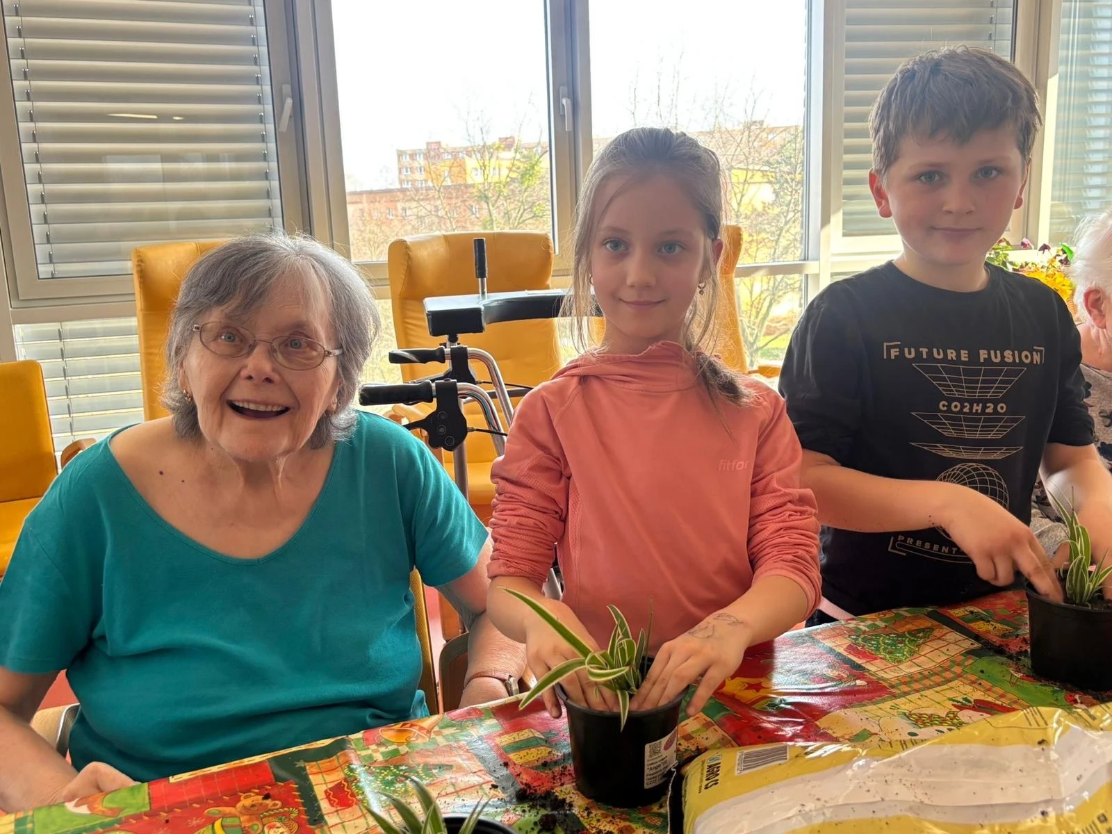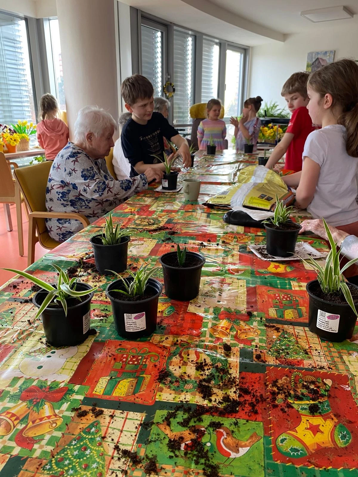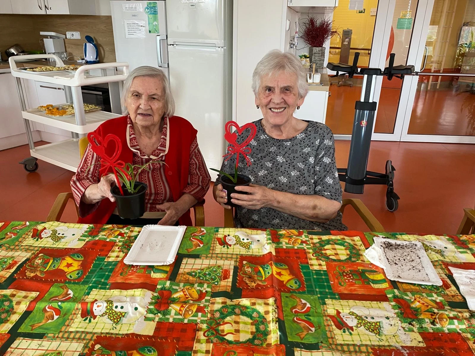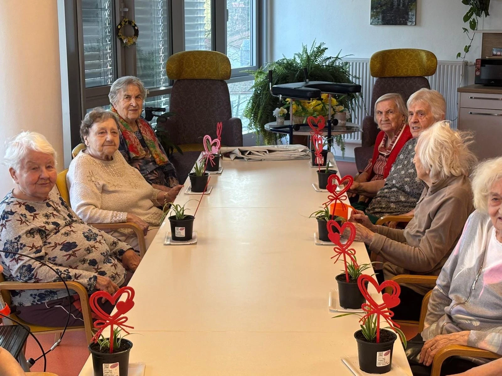 Pak přišla na řadu tvořivá část. Společně jsme sázeli pokojové rostliny a přitom si povídali o květinách a vzpomínkách na zahradničení. Každou kytičku si senioři ozdobili srdíčkovým zápichem, který na 3D tiskárně připravila paní učitelka Anička. Vznikla tak malá zahrádka radosti, připomínající krásu společného tvoření.
