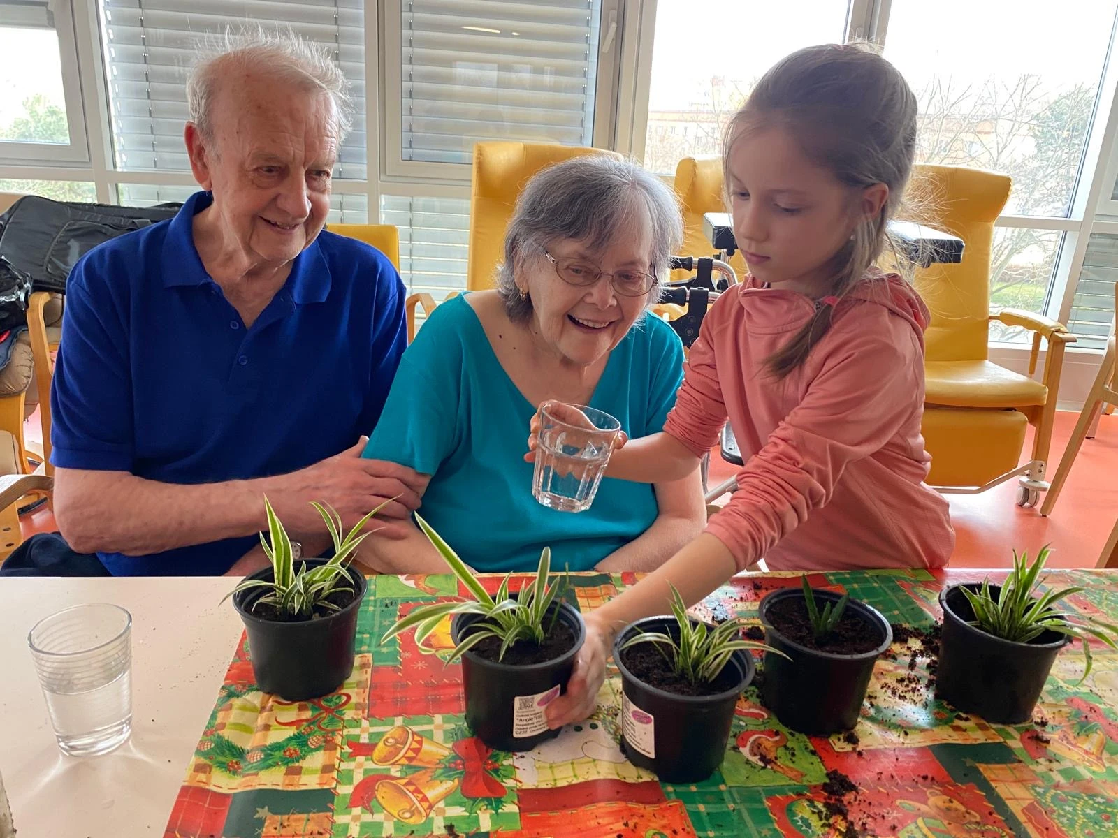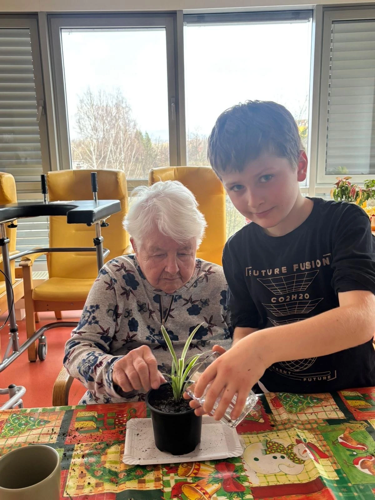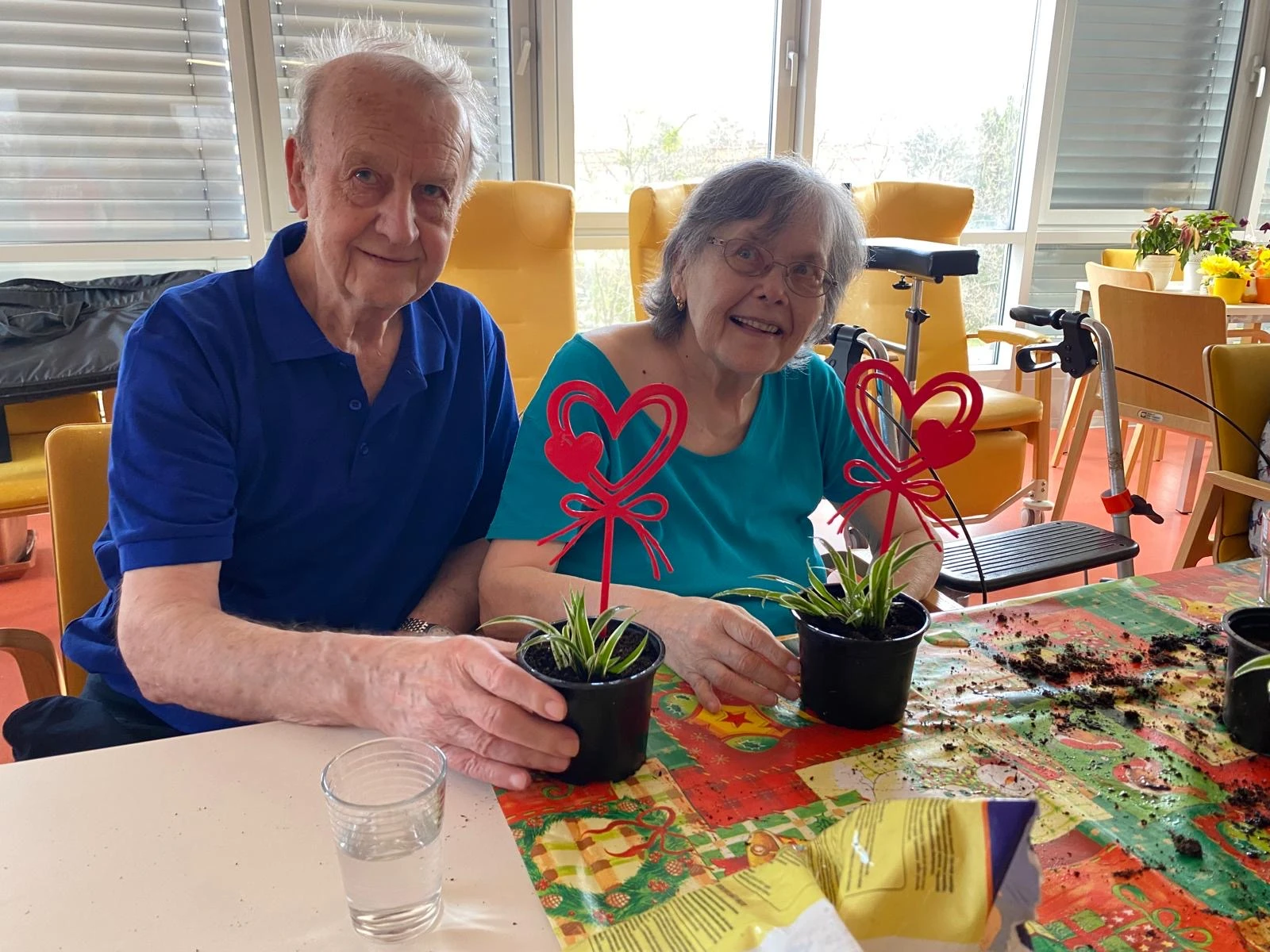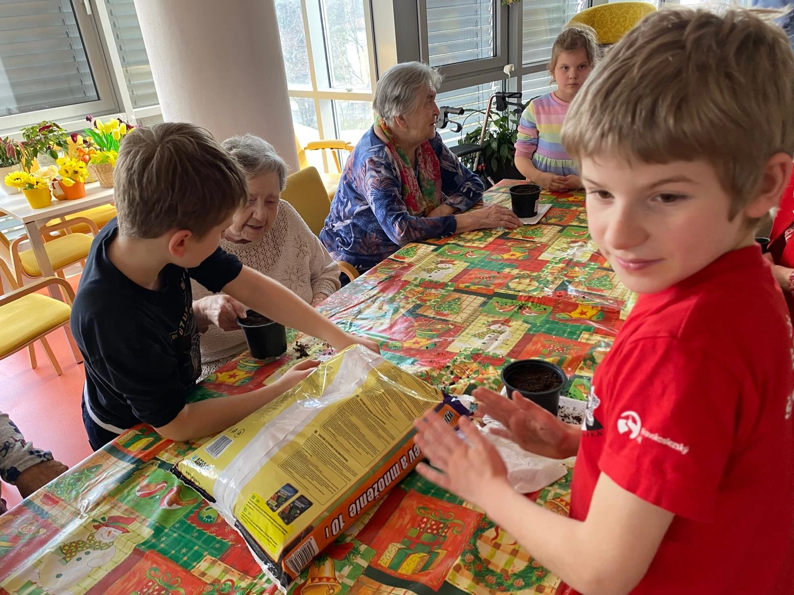 Pak přišla na řadu tvořivá část. Společně jsme sázeli pokojové rostliny a přitom si povídali o květinách a vzpomínkách na zahradničení. Každou kytičku si senioři ozdobili srdíčkovým zápichem, který na 3D tiskárně připravila paní učitelka Anička. Vznikla tak malá zahrádka radosti, připomínající krásu společného tvoření.