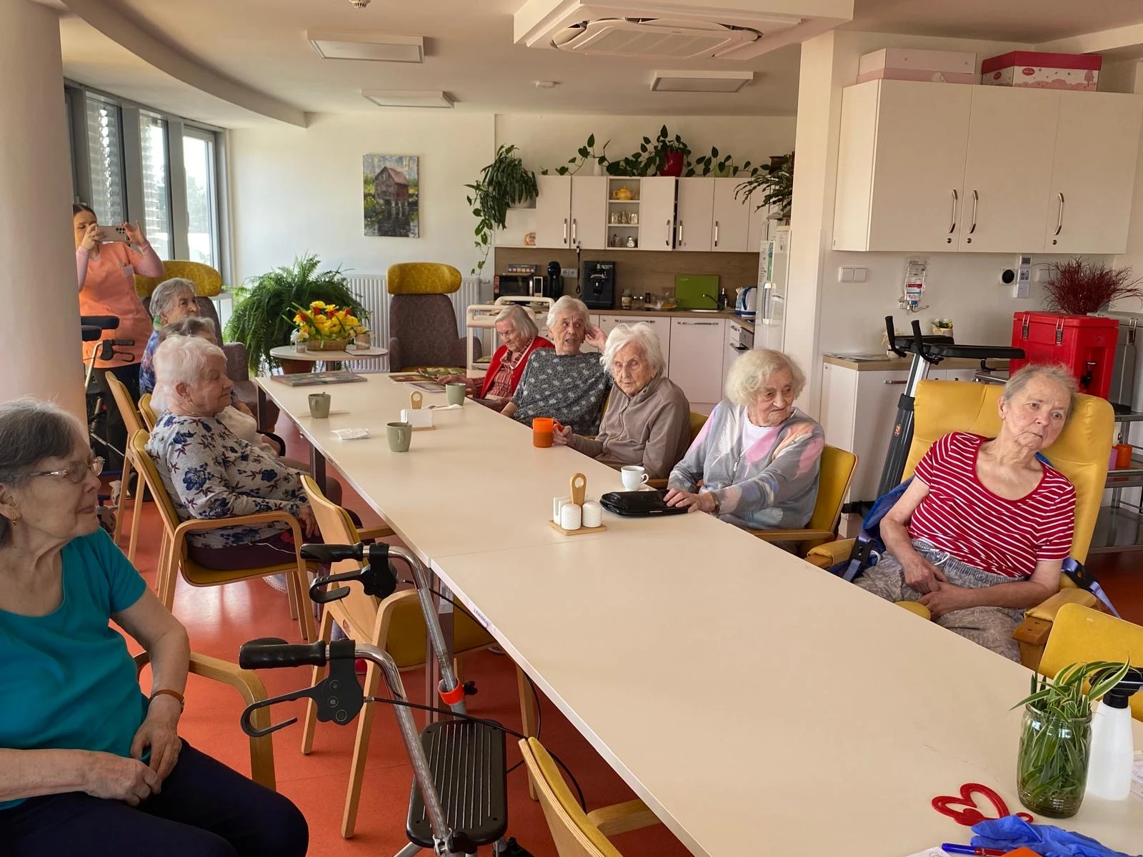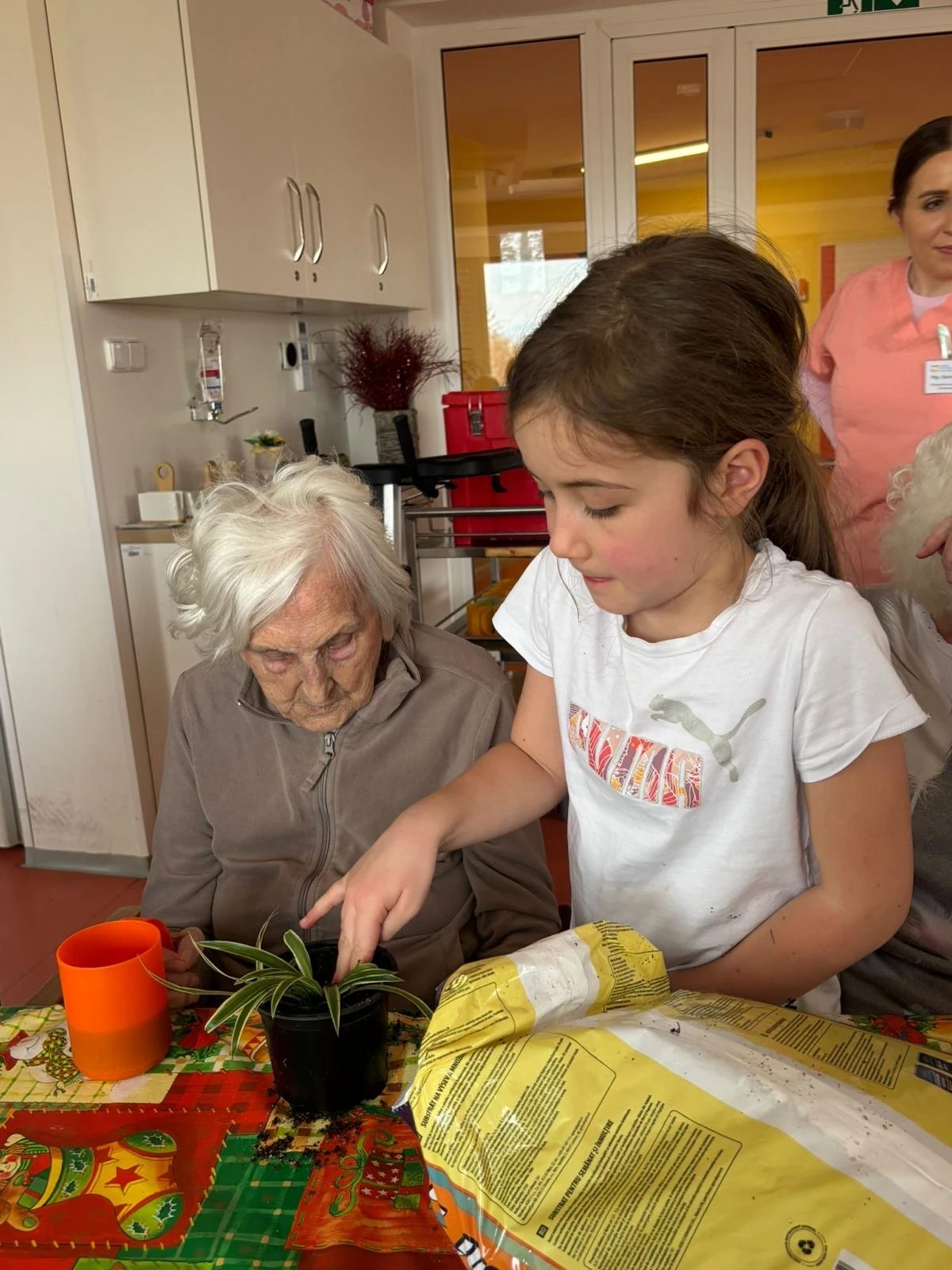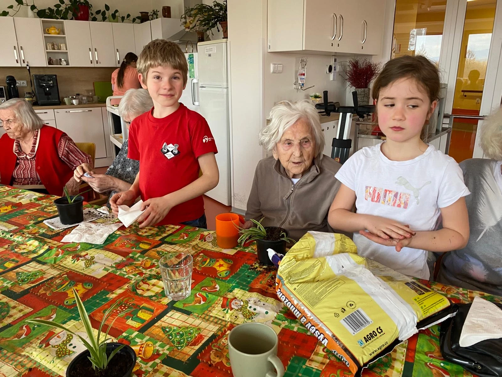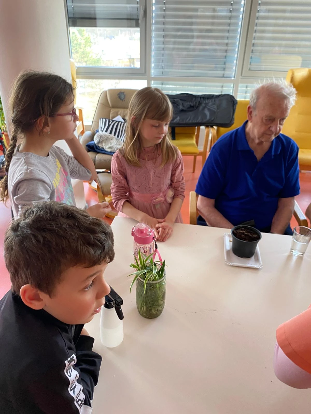 Pak přišla na řadu tvořivá část. Společně jsme sázeli pokojové rostliny a přitom si povídali o květinách a vzpomínkách na zahradničení. Každou kytičku si senioři ozdobili srdíčkovým zápichem, který na 3D tiskárně připravila paní učitelka Anička. Vznikla tak malá zahrádka radosti, připomínající krásu společného tvoření.
