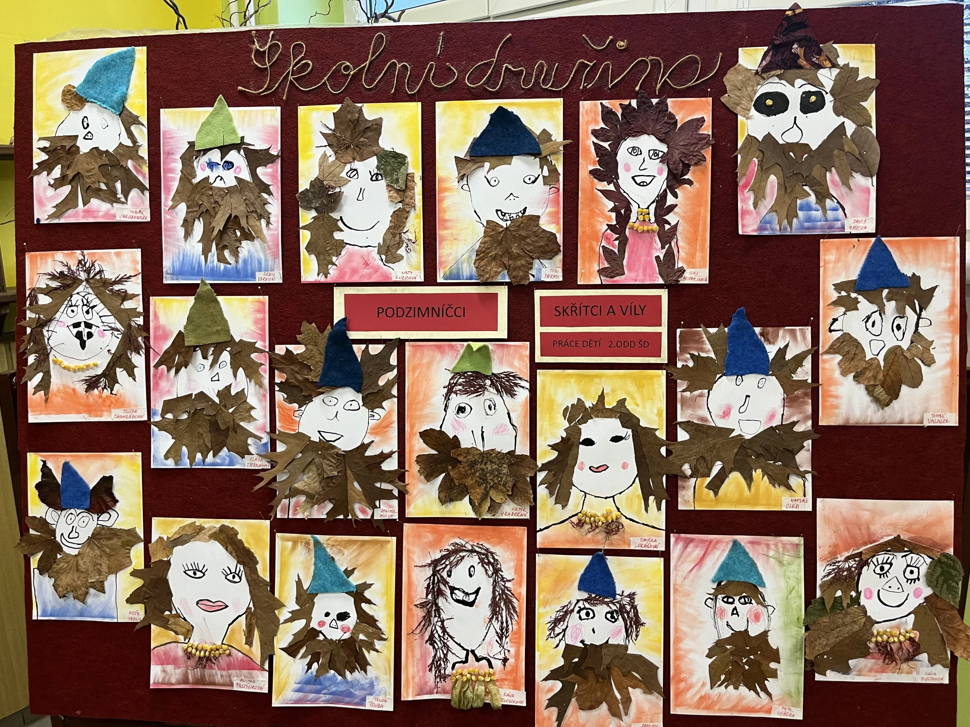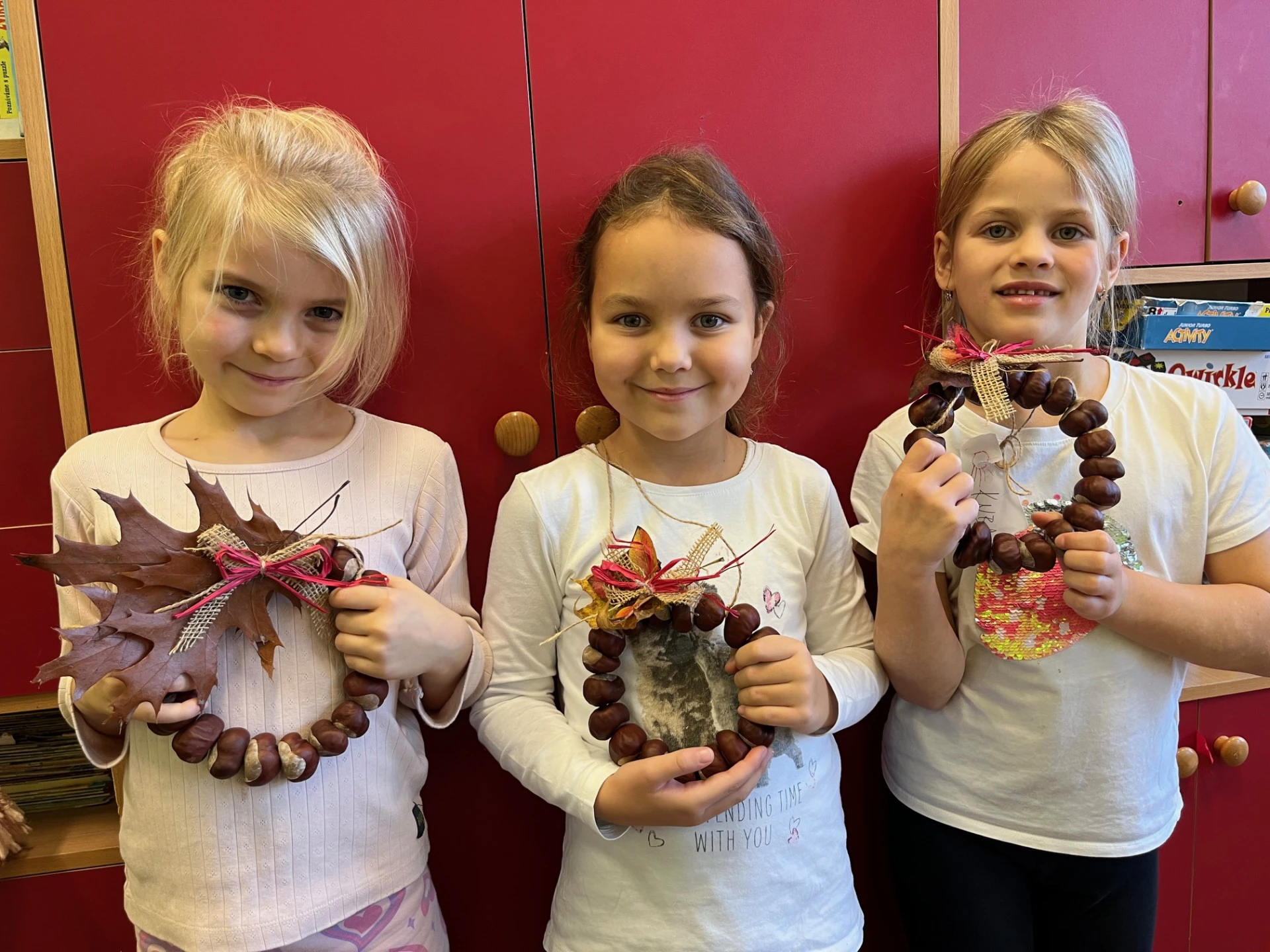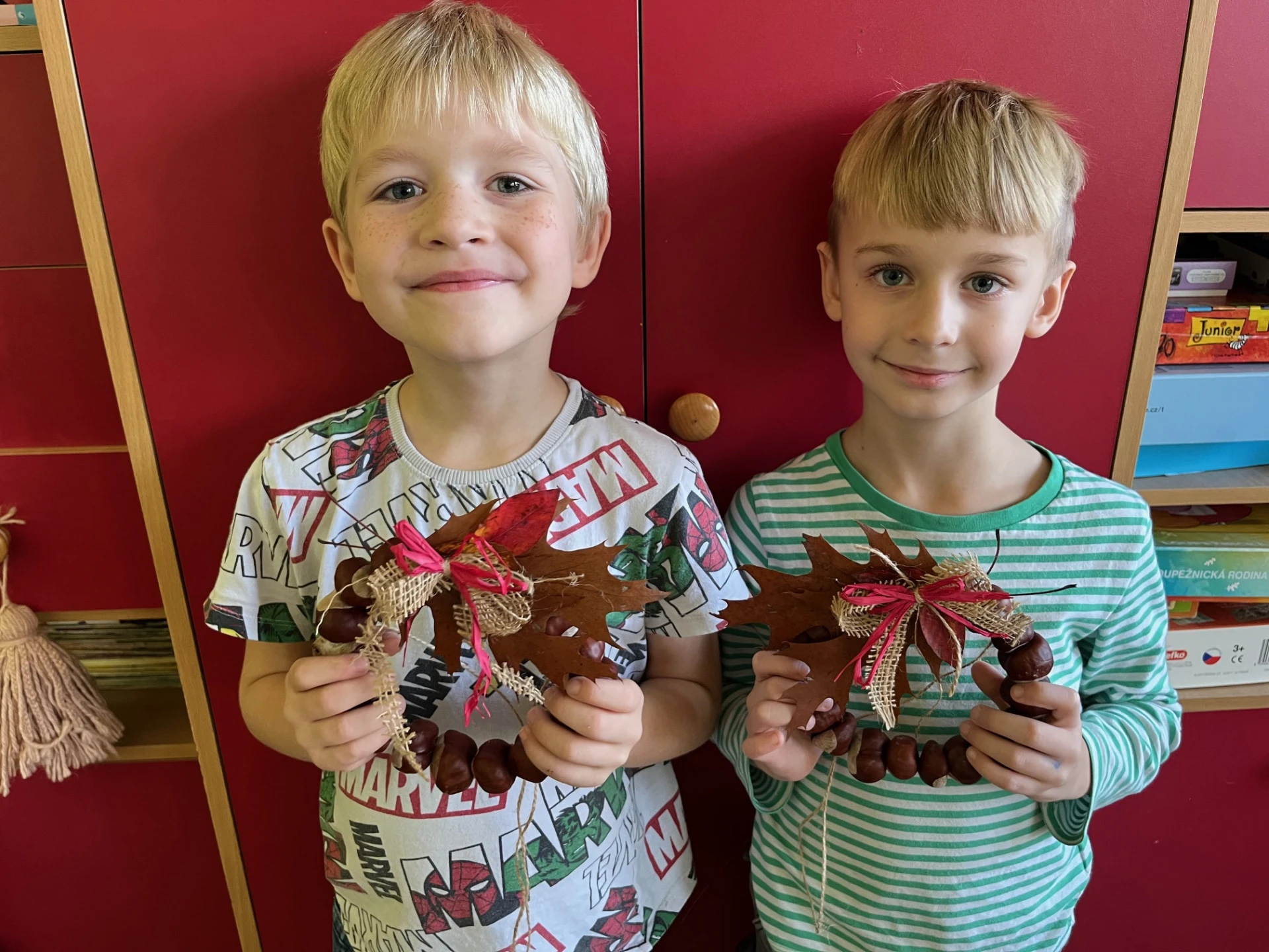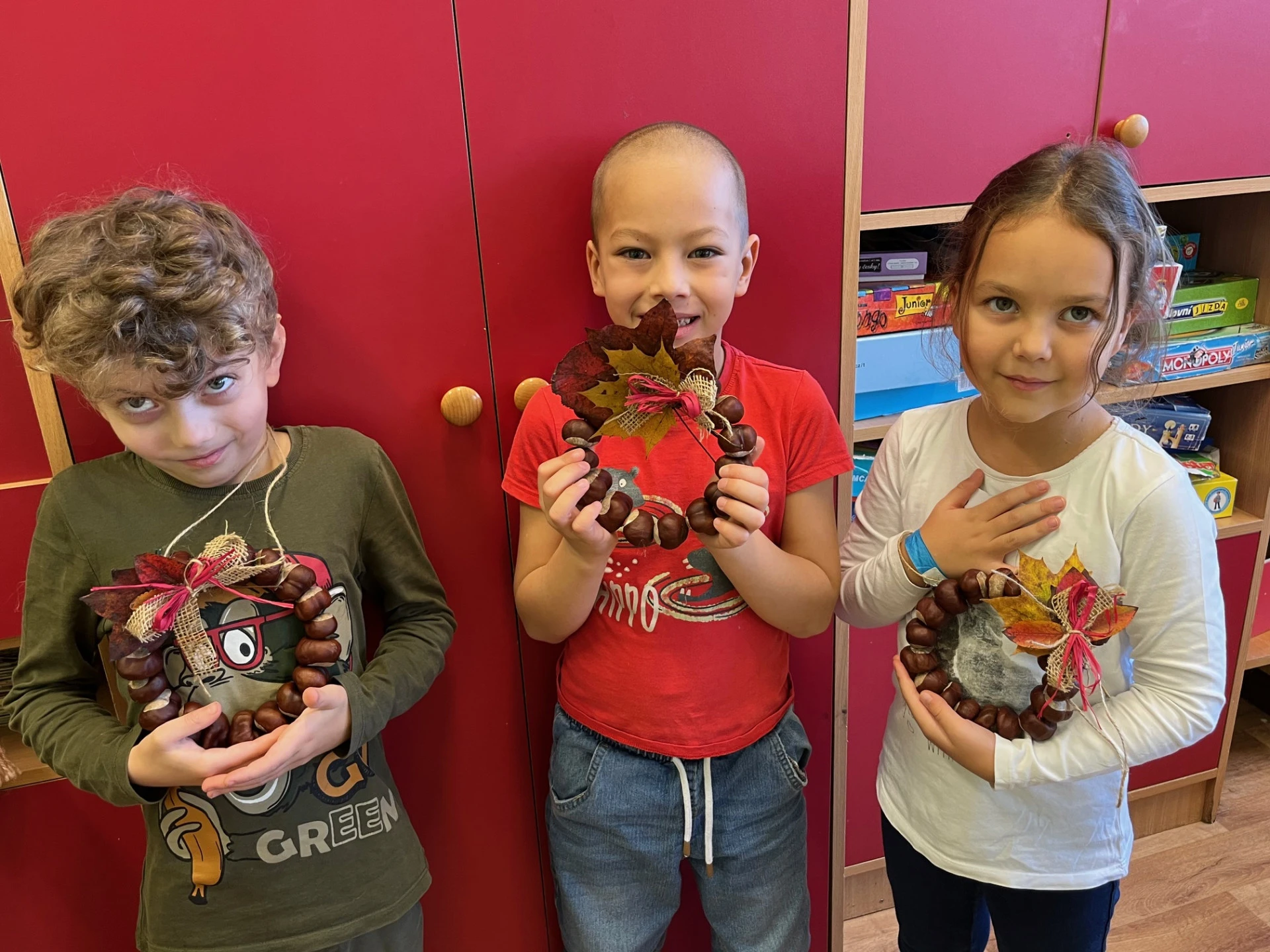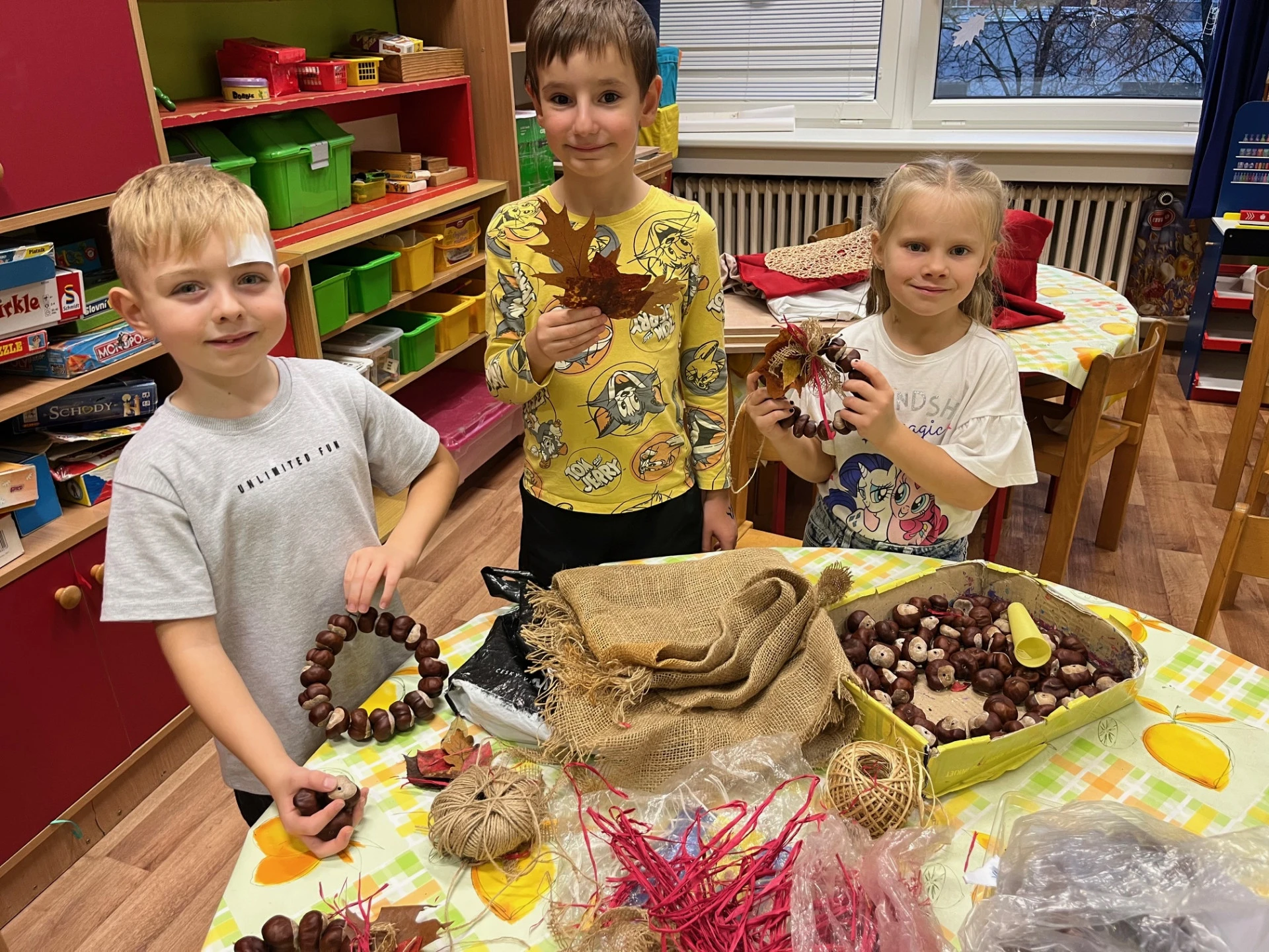 Podzim přináší spoustu barev a inspirace, tak jsme se pustili do tvoření z přírodnin, které jsme nasbírali během procházek. Z březových listů a kůry jsme vyrobili březový háj, z kaštanů věnečky na dveře. Nejvíce radosti dětem přinesla výroba „Podzimníčků“. Kluci vykouzlili skřítky a děvčata víly. Každý z nich měl jinou podobu a příběh. Děti tak zapojily fantazii i šikovné ruce a vytvořily kouzelný podzimní svět plný barev a radosti.