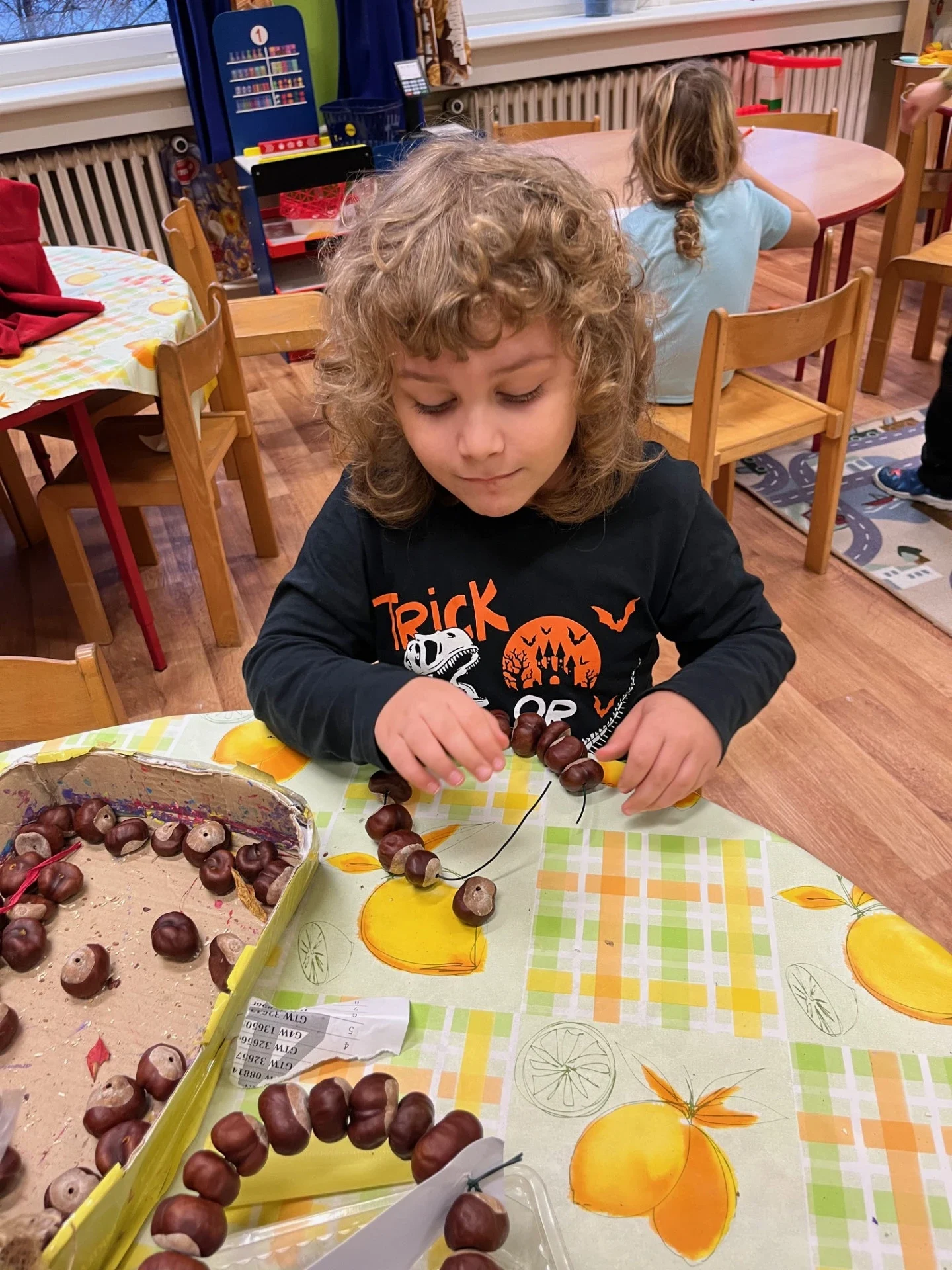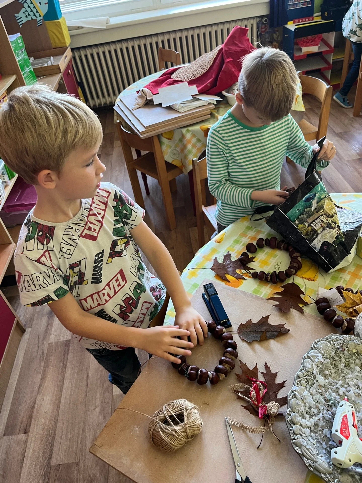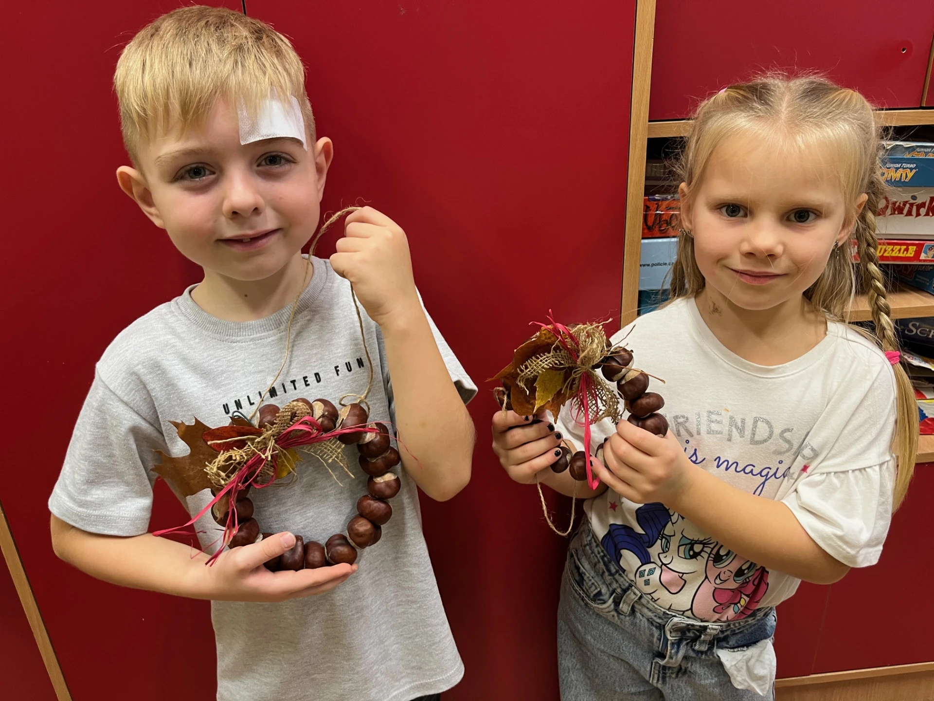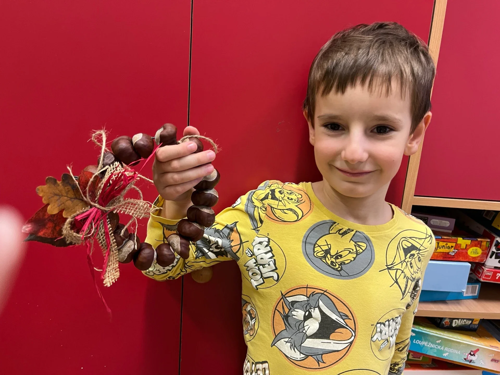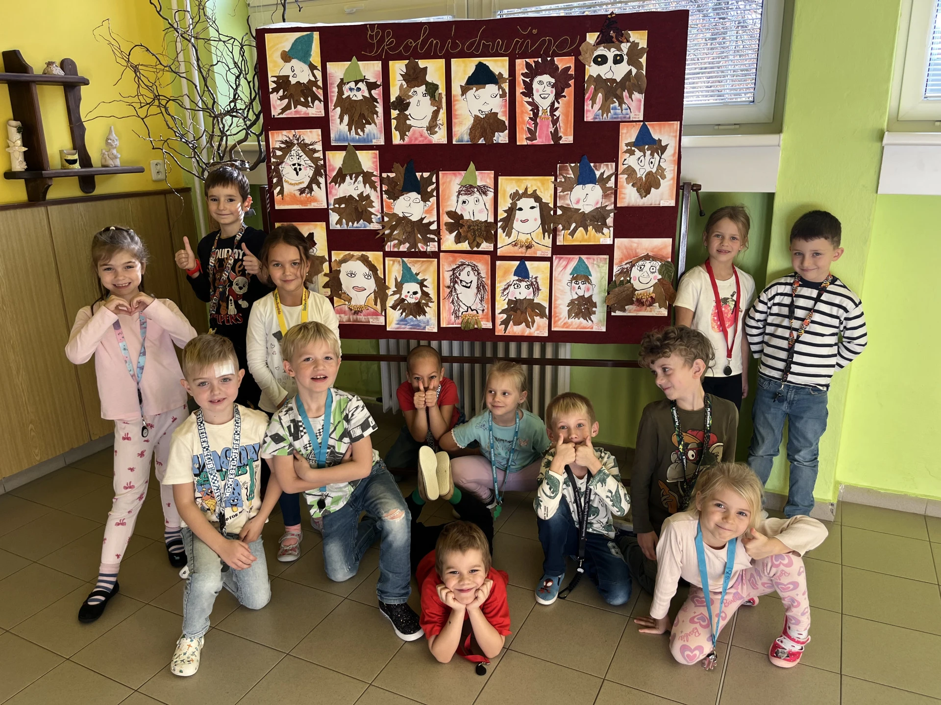 Podzim přináší spoustu barev a inspirace, tak jsme se pustili do tvoření z přírodnin, které jsme nasbírali během procházek. Z březových listů a kůry jsme vyrobili březový háj, z kaštanů věnečky na dveře. Nejvíce radosti dětem přinesla výroba „Podzimníčků“. Kluci vykouzlili skřítky a děvčata víly. Každý z nich měl jinou podobu a příběh. Děti tak zapojily fantazii i šikovné ruce a vytvořily kouzelný podzimní svět plný barev a radosti.